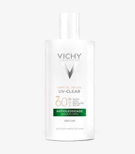 Protetor solar para peles oleosas. Vichy Capital Soleil UV Clear FPS60 conta com textura aqua-fluida, reduz a produção de oleosidade por horas.
